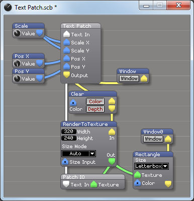 As mentioned above, patches are collections of modules where only limited ports and controls are exposed. They look similar to modules with the difference that the title bar is grey. However, in order to look what's inside this patch, you can just couble-click it, and the patch opens in another window (or in case you are using the Stage Patch page, you smoothly fly into this patch). In the case of the shown (left picture) text patch (which is available as system patch - right-click, Insert System Patch, select 'Text Patch.scb'), the contents is this (right picture):